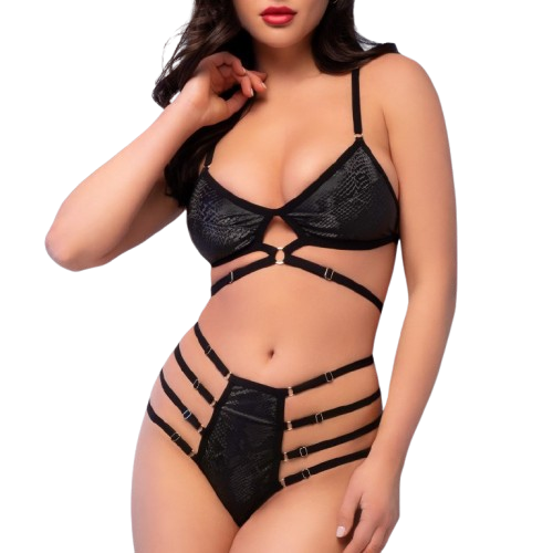 Descubra o encanto exótico do Conjunto de Sutiã Serpente, uma expressão de feminilidade e sofisticação. Este conjunto deslumbrante incorpora um sutiã sedutor, adornado com alças delicadas que realçam a silhueta com elegância. As cuecas, com ousadas tiras entrelaçadas, acrescentam um toque provocante à peça, elevando a sensualidade a novos patamares.
