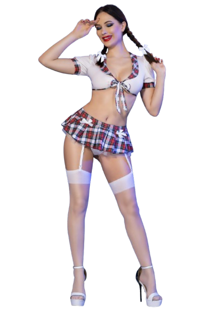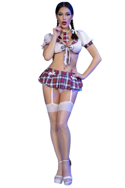 Liberta a tua criatividade com este Conjunto de Estudante Extravagante e Tentador, perfeito para fantasias ousadas ou ocasiões especiais. Inclui um top branco com amarração frontal e decote profundo, uma saia curta plissada decorada com laços e cinta-ligas destacáveis, meias brancas, 2 elásticos de cabelo, uma mini gravata e uma tanga sexy branca. Com detalhes encantadores e um toque provocante, é ideal para o Carnaval ou como um presente memorável. Cria momentos inesquecíveis com este conjunto irresistível.