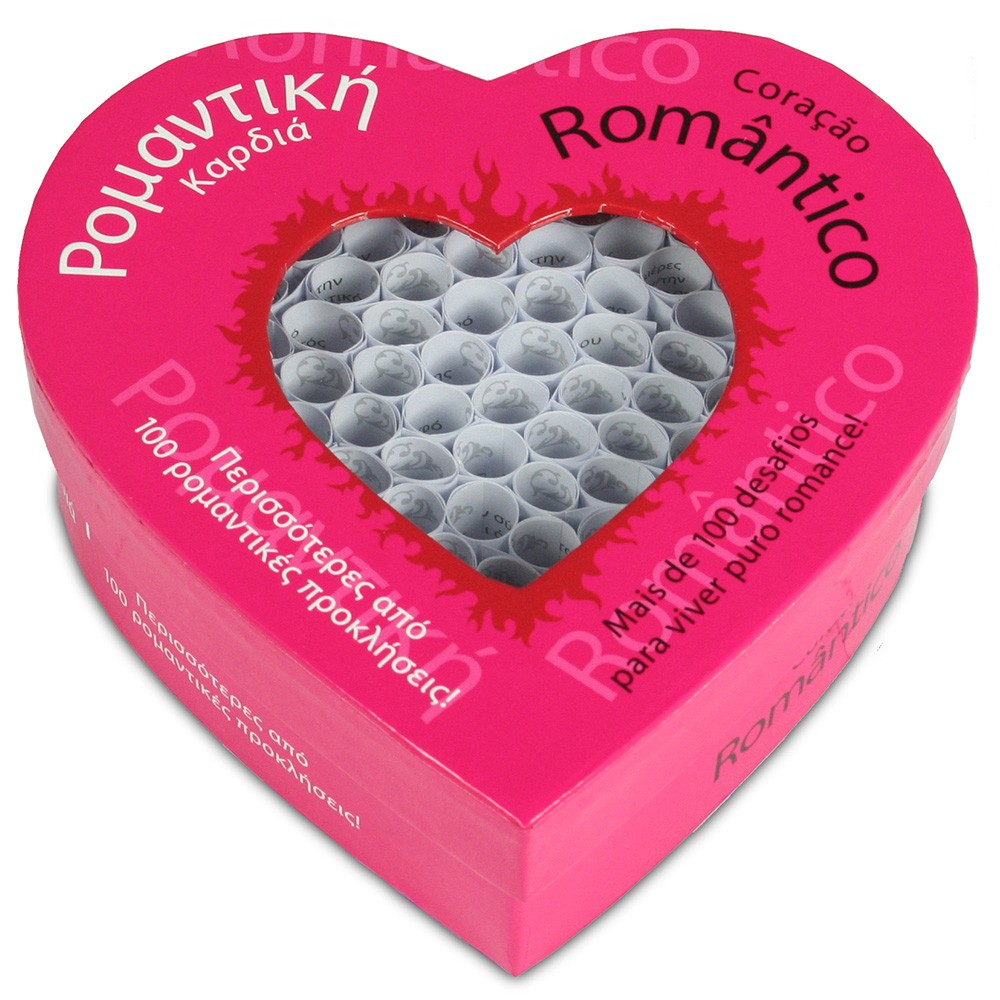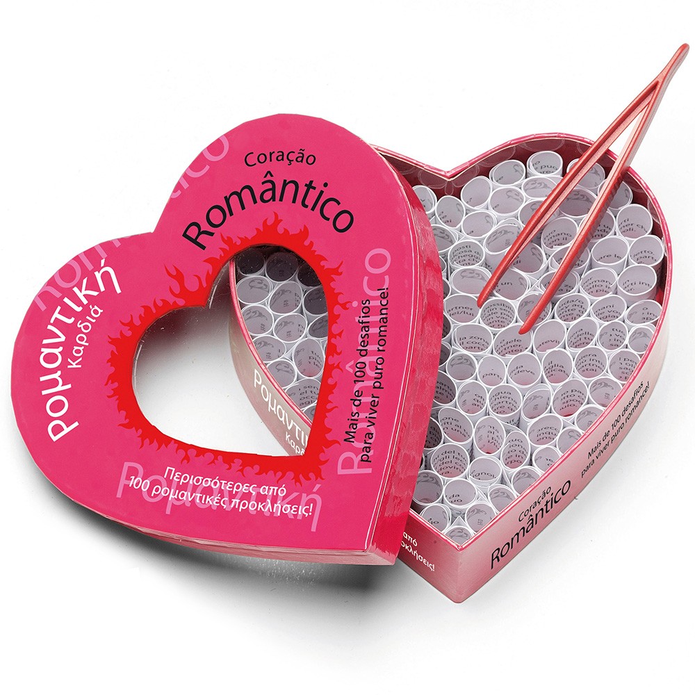 Peça ao seu parceiro para tocar a sua canção romântica preferida. Faça um trilho de pétalas de rosa ou acenda velas que conduzam o seu parceiro até um local onde tem uma surpresa à sua espera! Conte-lhe um sonho romântico que teve ou escreva um poema de amor. “Coração Romântico” é um jogo ousado e entusiasmante para si e para o seu parceiro. Cada um de vocês retira à vez um rolinho de papel da caixa, usando a pinça. O que irá acontecer agora? Será um fantástico e terno momento passado em conjunto, ou uma noite de intimidade e paixão? Este presente não é comparável com qualquer outro jogo, não há limites de tempo e ambos serão vencedores. Pode usar este presente a qualquer hora do dia e será por vezes surpreendida por uma iniciativa romântica do seu parceiro. Algumas tarefas podem ser jogadas imediatamente, mas preparar uma saída romântica à noite ou a preparação de uma surpresa conduzirão a fantásticos momentos passados juntos mais tarde.