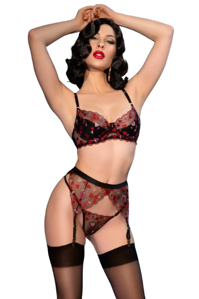 Sutiã bordado com corações, cinto de ligas, tanga e meias.