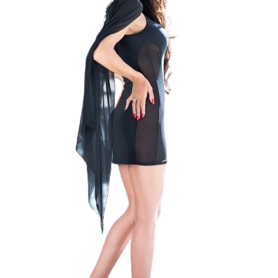 Deslumbre-se com a sofisticação atemporal deste mini vestido original em tecido preto opaco, que redefine a elegância contemporânea. O destaque fica por conta dos longos xailes de tule que conferem um toque de leveza e mistério, envolvendo a peça com graciosidade. As inserções transparentes nas laterais e no decote revelam uma sensualidade subtil, criando uma harmonia visual única.